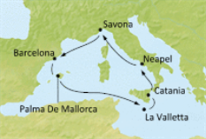 Unsere Route ging von/bis Savona. Sie führte durch das westliche Mittelmeer nach Barcelona, Palma de Mallorca, La Valetta, Catania und Neapel. Auf die Stationen wird später genauer eingegangen. Wir haben die Route gewählt, weil wir schon bei fast allen Destinationen waren und wir diese wieder sehen wollten. Und im Oktober ist es einfach traumhaft schön im Mittelmeerraum. Also zumindest meistens. Diesmal hatten wir auch im Mittelmeer eher Herbst. Aber auch das wird bei den einzelnen Destinationen beschrieben. Ausserdem hat man noch den Vorteil der Nebensaison, so daß die ganze Reise recht günstig gebucht werden kann. Im Sommer kostet die selbe Reise in etwa das doppelte. Und so fahren wir lieber 2x im Jahr in der Vor- und Nachsaison als nur einmal im Sommer. Und auch die Temparaturen wären mir im Sommer in diesen Breitengraden viel zu hoch. Bei 35 oder gar 40 Grad eine Stadt zu besichtigen ist für uns der Alptraum. Trotzdem kann man auch Ende Oktober noch davon ausgehen, dass es sogar so warm wird, um noch im Meer baden zu gehen, denn das Wasser ist vom Sommer noch mehr als warm genug. Selbst im Dezember war es uns 2012 auf Malta noch gut möglich in einer schönen Bucht zu baden.