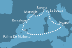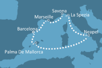 Unsere Route ging von/bis Savona. Sie führte durch das westliche Mittelmeer nach Marseille, Barcelona, Mallorcan Neapel und La Spezia. Auf die Stationen wird